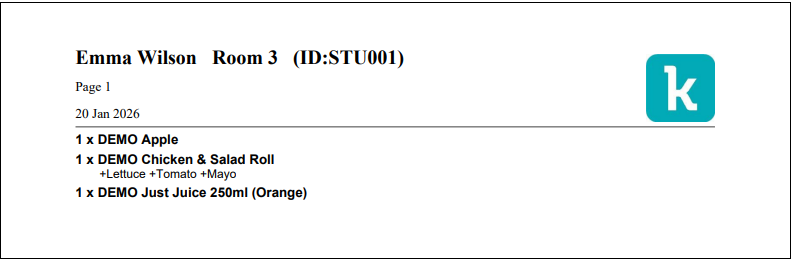 Includes student name, room, student ID, order date, items purchased, and any options or choices
