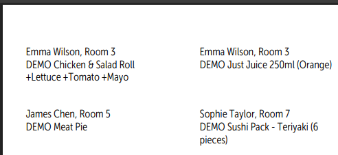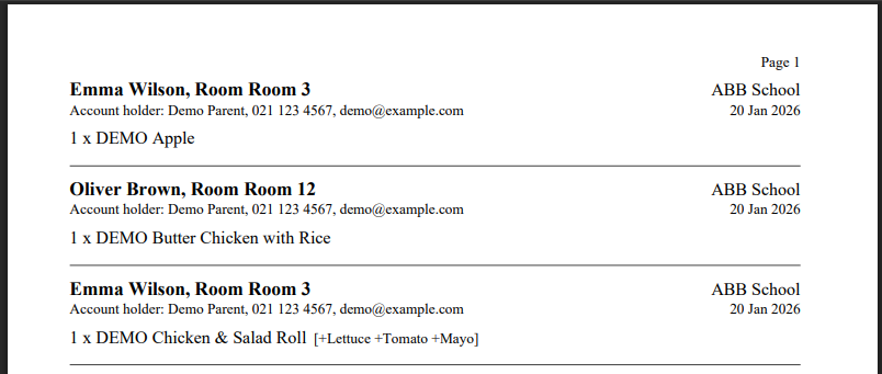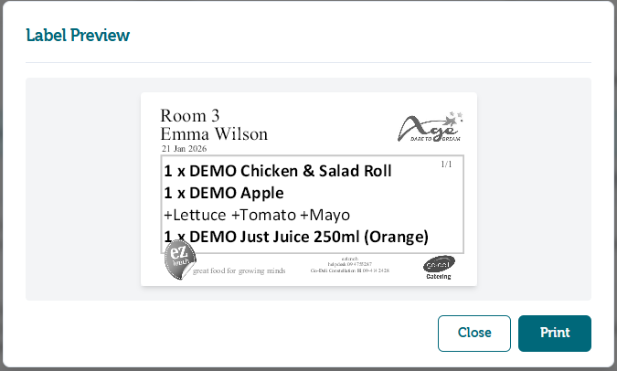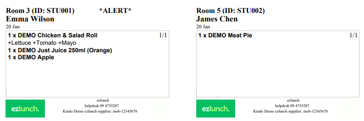 - Each label shows the student name, room, items purchased, logos and allergy alerts