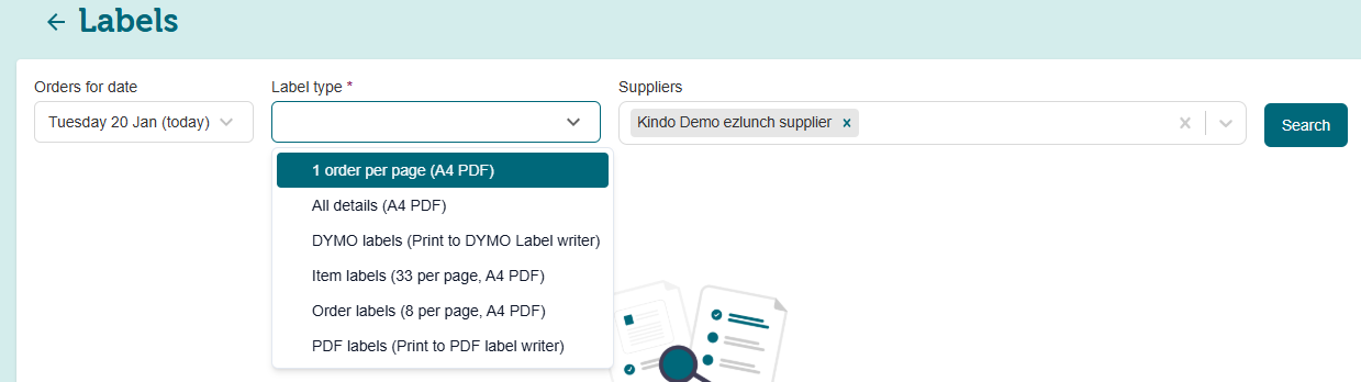To print test orders, select a label type, tick Preview labels (demo data), then choose Search. Labels will be generated using demonstration data and will not affect live orders.